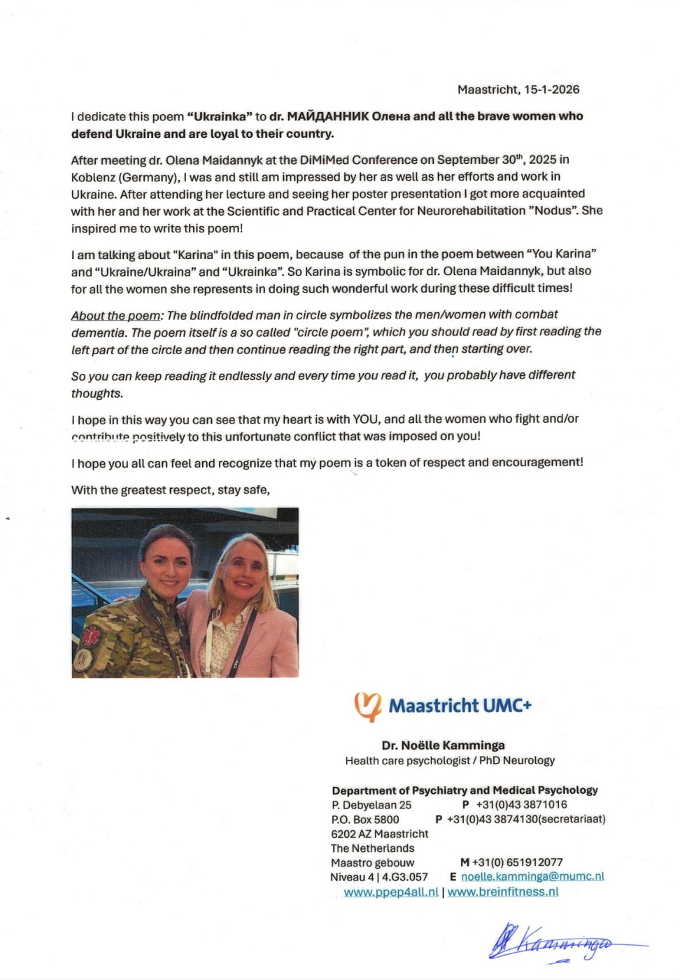 Восени 2025 року під час конференції DiMiMED (13th DiMiMED CONFERENCE ON DISASTER AND MILITARY MEDICINE «Anticipating the Unknown – Preparing for the Future») мала честь познайомитися з доктором, чудовою жінкою, яка має світле та добре серце - Dr. Noëlle Kamminga, PhD Meurology (Maastricht Universitair Medisch Centrum, Medical Psychology Maastricht, Netherlands).