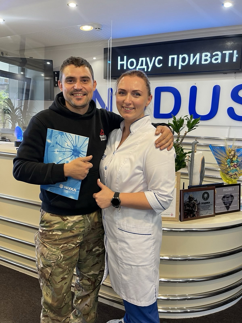 В рамках Меморандуму №5275 від 12.04.2021 між Міністерством Оборони України та ТОВ "НПЦНР "Нодус" про спільні заходи щодо реабілітації військовослужбовців ЗСУ та відповідно до Благодійного проекту "Нодус", пацієнту була розроблена відповідна індивідуальна програма реабілітації, і впроваджена на базі клініки.